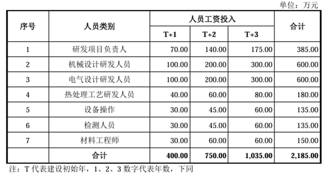 对于这2185万元的研发人员薪资支出,公司方面给出的解释是,按照项目建设期内预计增加的研发人员数量和部分真空设备上市或挂牌公司披露的研发人员平均薪酬水平测算所需薪资规模。