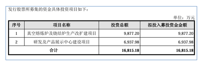 当然,令人关注的还是该公司用募资支付研发人员薪资的问题。该公司本次IPO拟募资1.68亿元,主要用于两个项目。一是真空熔炼炉及烧结炉生产改扩建项目,投资9877.20万元;二是研发及产品展示中心建设项目,投资6937.98万元,总计16815.18万元。