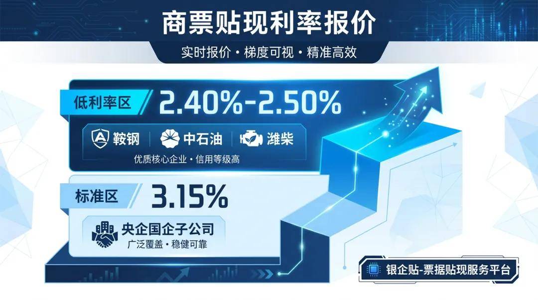 2.40%-2.50%这个低利率区间的企业,比如中国石油集团、鞍钢股份、潍柴重机,它们都是响当当的知名大型央企国企。它们信用等级高,在银行那里是妥妥的"白名单"客户,银行抢着做它们的业务。所以,它们的商票自然就好贴,利率也低。