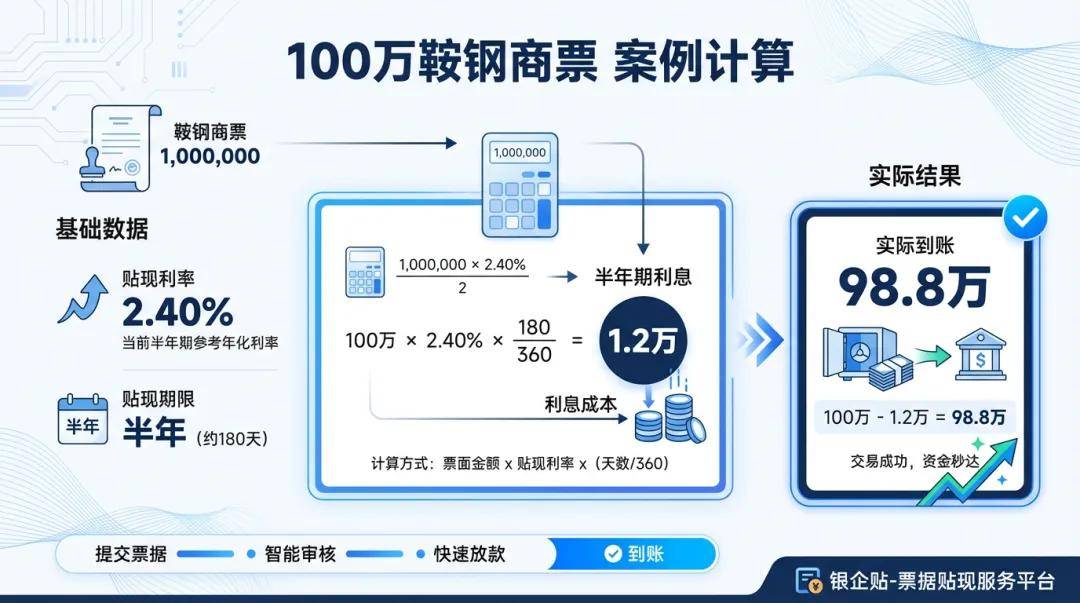 也就是说,张老板贴这张100万的鞍钢商票,大概只需要支付1.2万元的利息。这笔钱在急用的时候,可真是帮了大忙。