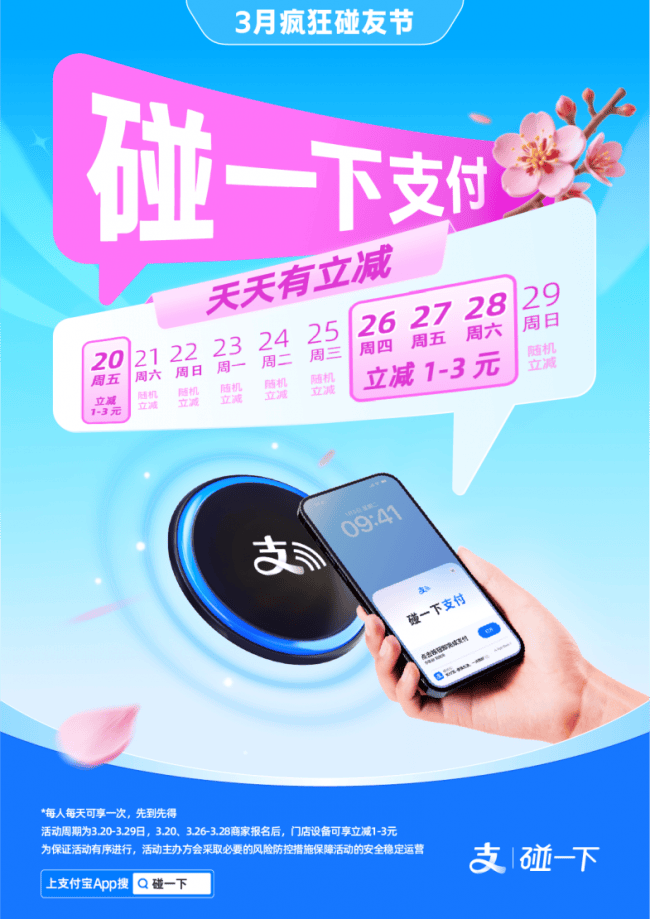 为持续激发上海消费市场活力,推动支付便利化与智慧消费场景深度融合,支付宝于上海正式启动“疯狂碰友节”促消费活动,活动将持续至本月29日。活动期间,消费者在上海线下接入“碰一下”支付服务的门店完成支付,即可享受多重消费优惠,以实实在在的福利拉动本地消费,助力马年消费市场实现开门红。