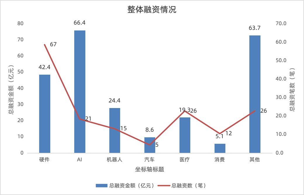 硬件板块融资笔数最多,达67笔,总金额42.4亿元,呈现「小额高频」的活跃态势,是本周交易最密集的赛道。