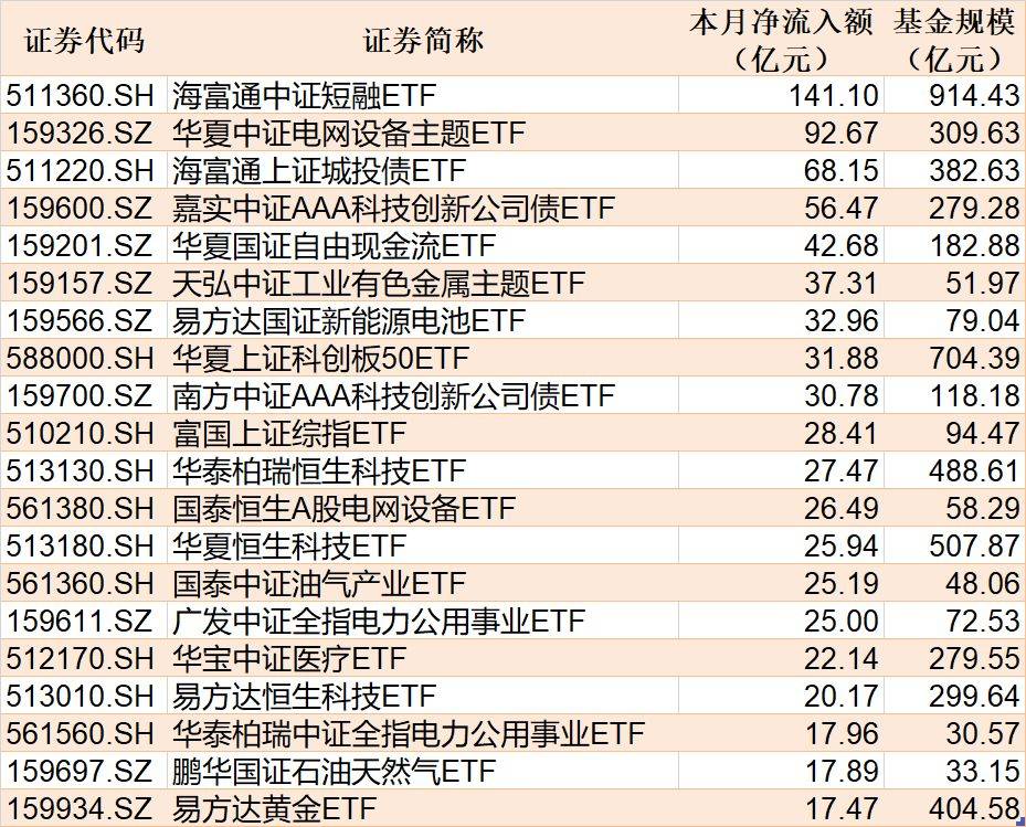 与此同时,华安黄金ETF基金份额减少1.33亿份,净流出额12.56亿元;博时中证可转债及可交换债券ETF基金份额减少0.82亿份,净流出额11.36亿元;富国上证综指ETF基金份额减少9.21亿份,净流出额9.04亿元。