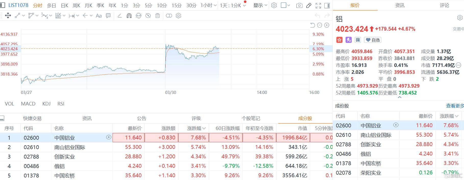 港股中,中国铝业涨超7%,南山铝业国际涨超5%,创新实业涨超4%,俄铝、中国宏桥等跟涨。