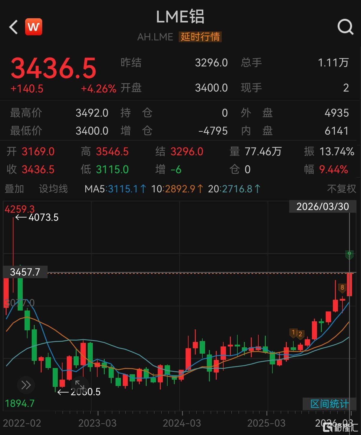 今日(3月30日)开盘,国际铝价大幅走高,伦敦金属交易所(LME)的铝价一度飙升6%,至每吨3492美元,创下自3月19日以来的新高。