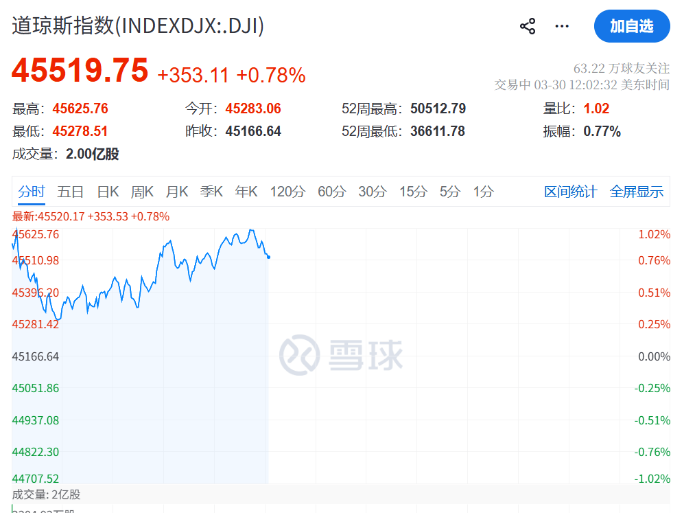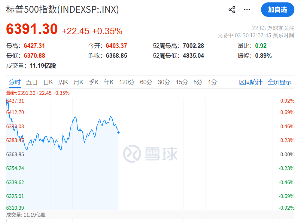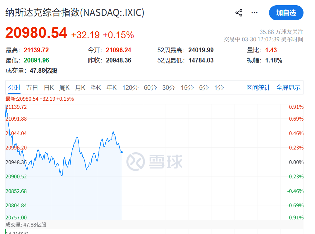 3月30日晚间,美股三大指数盘初高开低走,截至发稿,道指维持大概400点的涨幅,纳指则表现较为震荡,盘初一度涨约0.9%,但目前抹去了大部分的涨幅。整体而言,三大指数时而拉升,时而直线下挫,主要受到了中东战争以及美联储主席鲍威尔讲话的影响。
