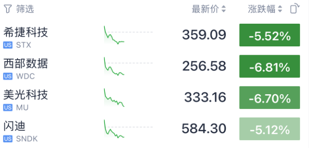 个股方面,今晚存储芯片板块跌幅居前。