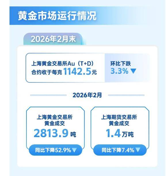 3月31日,央行发布2026年2月金融市场运行情况。2026年2月末,上海黄金交易所Au(T+D)合约收于每克1142.5元,环比下跌3.3%。2026年2月,上海黄金交易所黄金成交2813.9吨,同比下降52.9%;上海期货交易所黄金成交1.4万吨,同比下降7.4%。