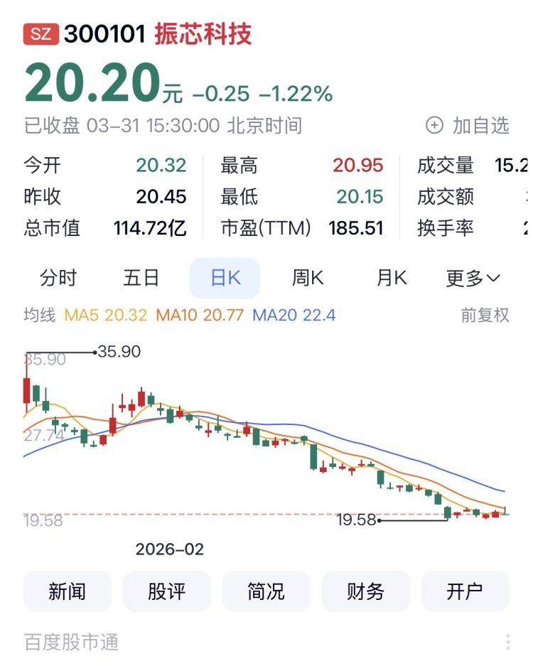 振芯科技报收20.20元,日涨幅-1.22%,换手率2.70%,月涨幅-25.68%,第一季度涨幅-28.95%。