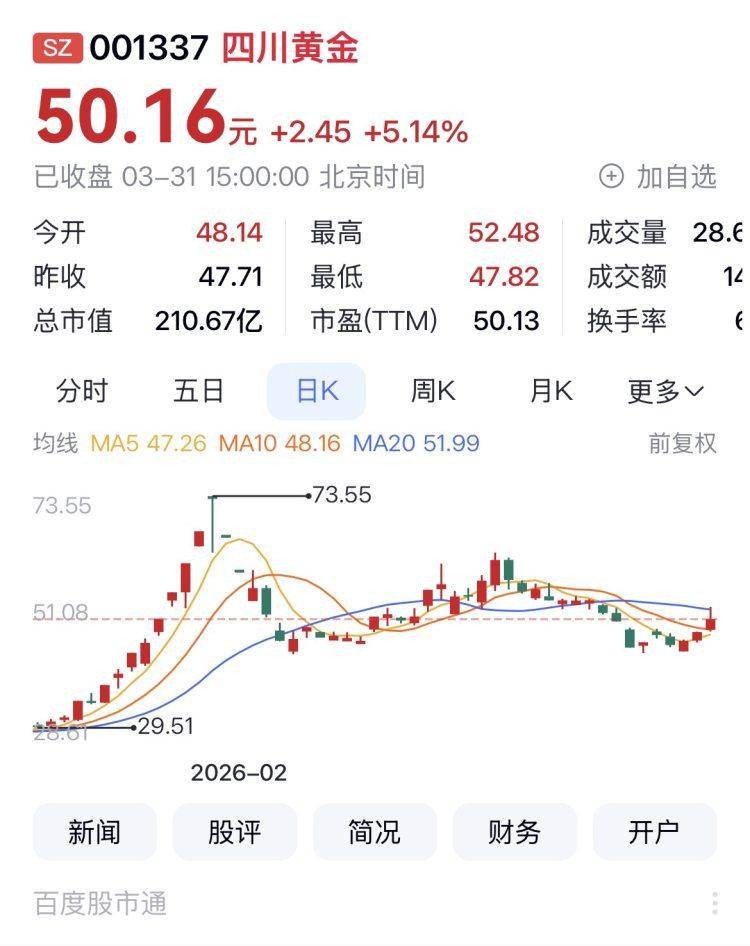 四川黄金报收50.16元,日涨幅5.14%,换手率6.83%,月涨幅-1.01%,第一季度涨幅80.04%,列第一。