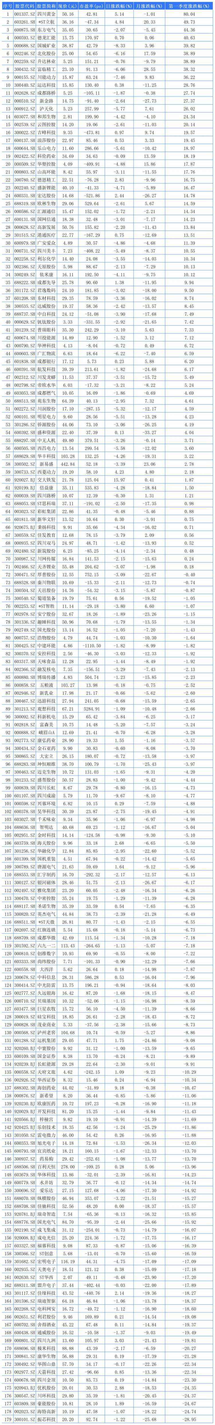 收跌川股有108家,振芯科技、海特高新和豪能股份分别以-28.95%、-24.74%和-24.67%,列第一季度涨幅最后三位。