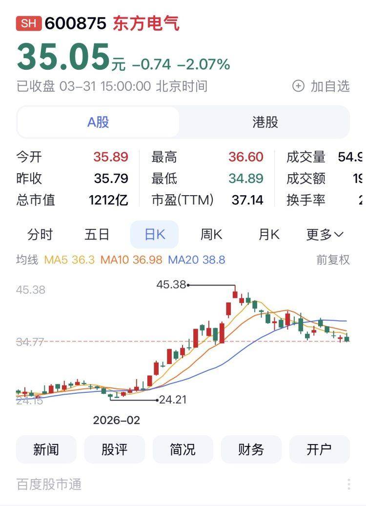 东方电气报收35.05元,日涨幅-2.07%,换手率2.43%,月涨幅-5.45%,第一季度涨幅44.36%,列第三。