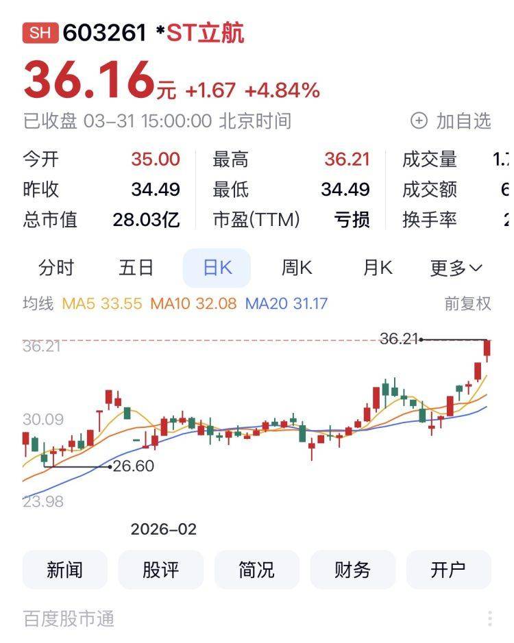*ST立航报收36.16元,日涨幅4.84%,换手率2.20%,月涨幅20.33%,第一季度涨幅49.73%,列第二。