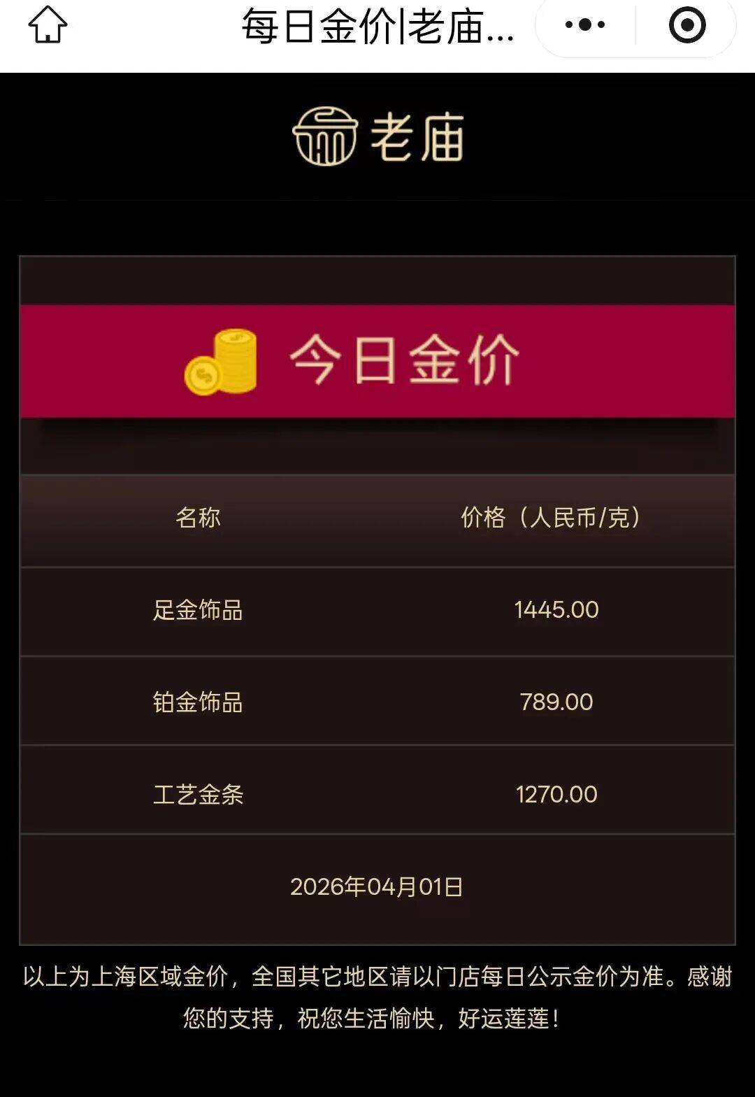 4月1日,国内多家黄金珠宝品牌金饰价格大幅上涨,克价均升至1400元上方,其中,周生生足金饰品价格报1447元/克,周大福、老庙黄金足金饰品价格报1445元/克。
