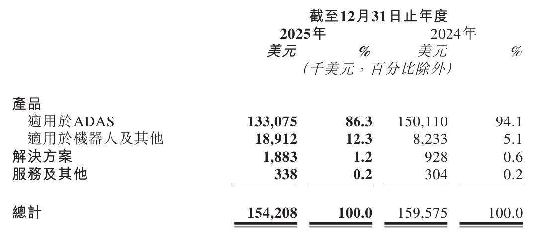 图达通2025年适用于ADAS产品收入为1.33亿美元,较上年同期的1.5亿美元下降11.3%;适用于机器人及其他的收入为1891万美元,占比为12.3%;
