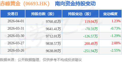 证券之星消息,4月1日南向资金增持119.04万股赤峰黄金(06693.HK)。近5个交易日中,获南向资金减持的有3天,累计净减持129.57万股。近20个交易日中,获南向资金增持的有7天,累计净增持347.28万股。截至目前,南向资金持有赤峰黄金(06693.HK)9760.45万股,占公司已发行普通股的41.26%。