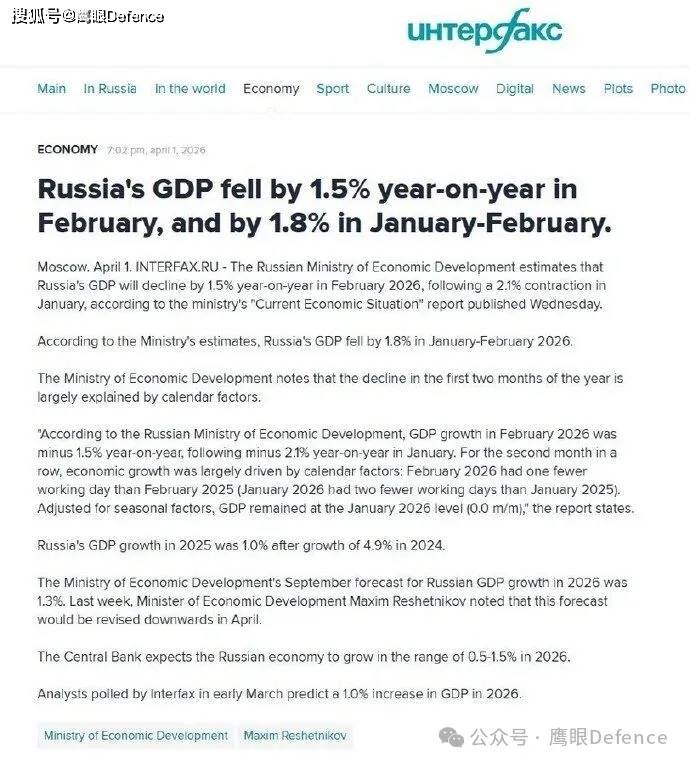 俄罗斯经济发展部数据显示,俄罗斯GDP连续第二个月下滑,2月份下降了1.5%,今年前两个月的GDP降幅为1.8%:注意,这是俄罗斯政府的官方数据。
