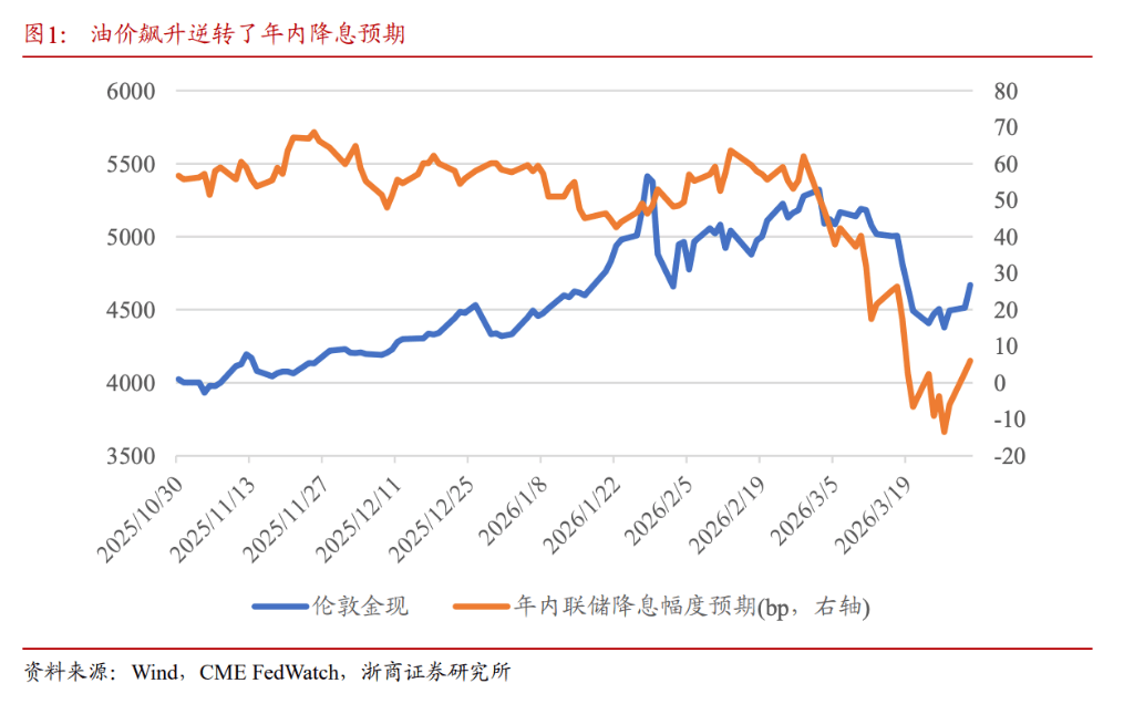 第一,油价飙升逆转降息预期,全球流动性整体收缩。随着油价快速上涨,年内降息预期迅速回撤,市场甚至在3月20日前后开始预期年内加息,直接带来全球流动性环境整体收紧,对黄金形成压制。
