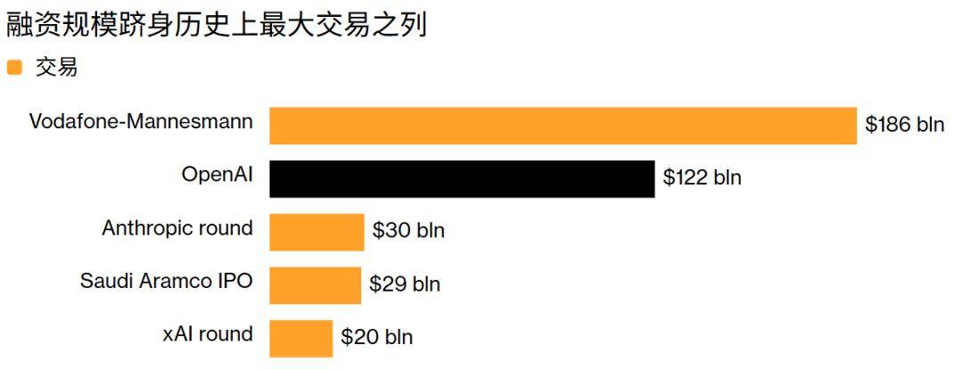 从任何角度来看,OpenAI 的融资都是历史上规模最大的交易之一——不仅远超同为私人支持的初创公司之前的融资轮次,也超过了并购和首次公开募股。这反映了人们对这项被视为对公司、行业乃至整个经济都具有变革性的技术的巨大热情。彭博汇编的数据显示,该融资远超同为AI 初创公司Anthropic 和 xAI 最近的融资轮次。