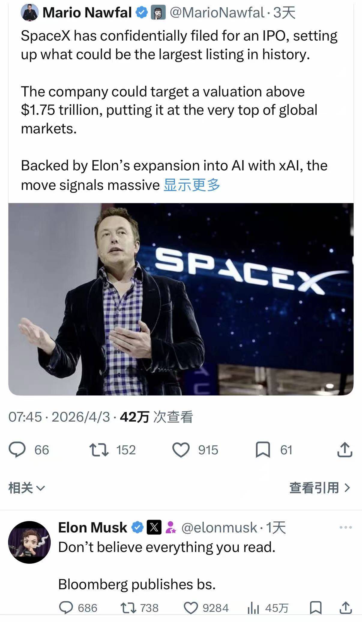 日前,马斯克在X上否认彭博社关于SpaceX即将启动估值超2万亿美元IPO的报道,称其为“胡说八道”。此前彭博社援引匿名顾问消息称,SpaceX拟融资750亿美元,估值或达2万亿美元。