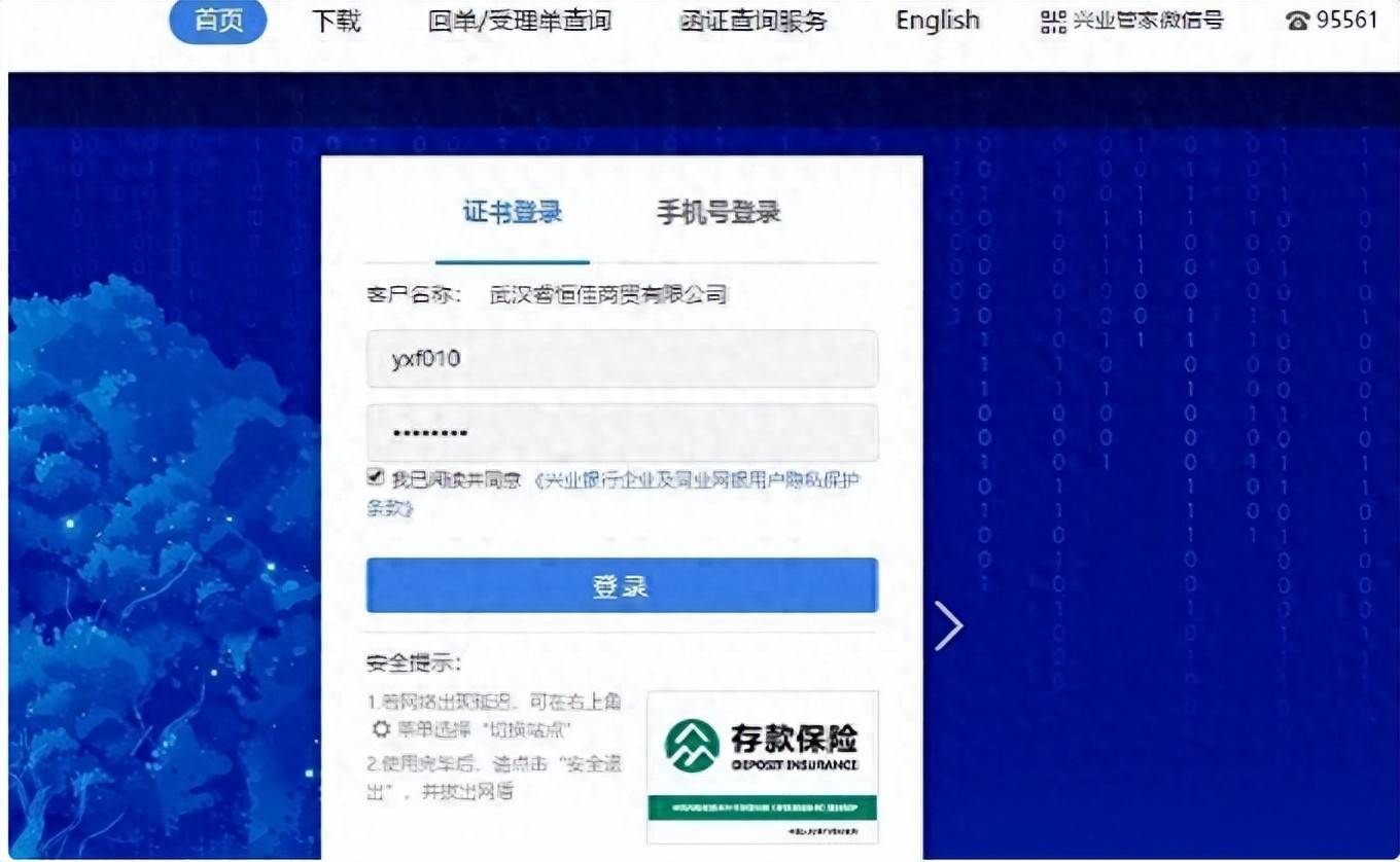 第一步:插上经办U盾,打开兴业银行企业网银,输入用户名和密码登录。