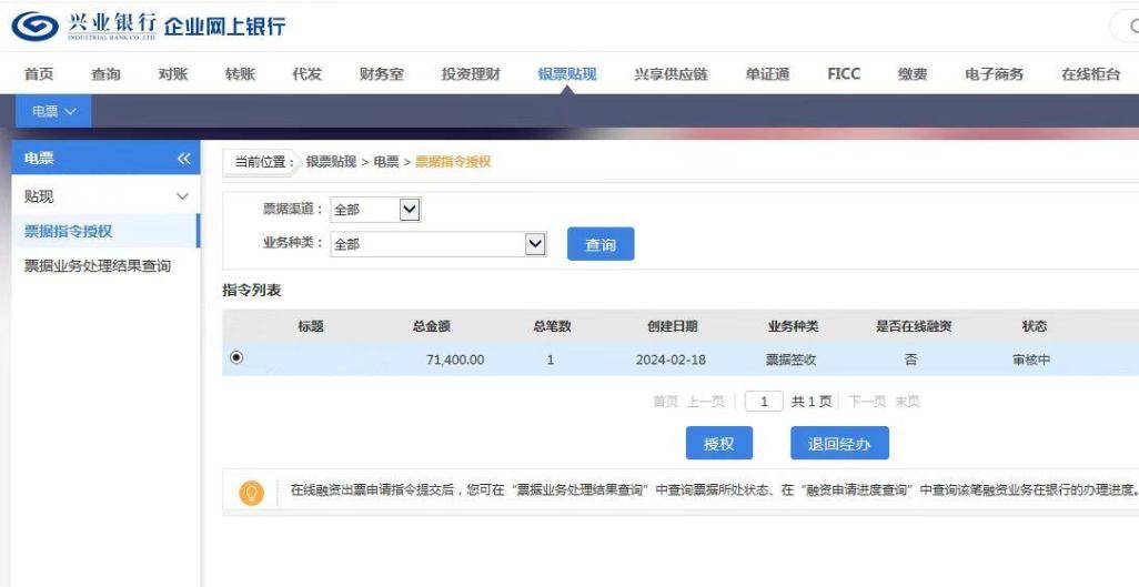 第三步:接下来需复核/授权人员换U盾重新进入企业网银,进行票据指令授权,核对相关信息无误后,输入U盾密码,最后点确认完成。这样上家背书进来的新一代票据就可以签收进自己的账户了。