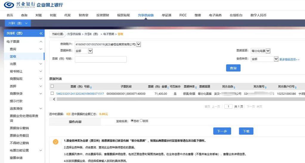 第二步:点击 兴享供应链 - 兴享E(票) - 电子票据 - 签收 ,在查询账户选择账户名称,票据渠道选择“等分化票据”,票据种类和业务种类都选择“全部”,然后单击“查询”,上家背书进来待签收的等分化票据,都会在列表中显示出来。接下来选择要签收的等分化票据,点击“下一步”,这样经办U盾的签收生成指令已完成。