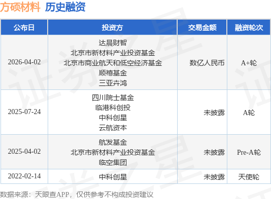 证券之星消息,根据天眼查APP于4月2日公布的信息整理,北京方硕复合材料技术有限公司A+轮融资,融资额数亿人民币,参与投资的机构包括达晨财智,北京市新材料产业投资基金,北京市商业航天和低空经济基金,顺禧基金,三亚卉鸿。