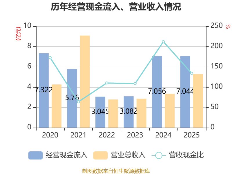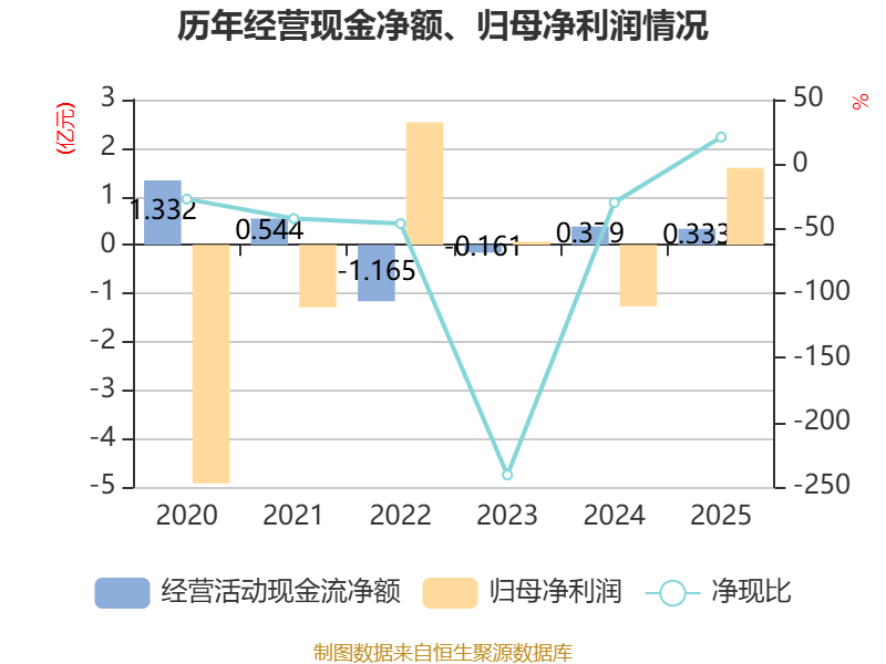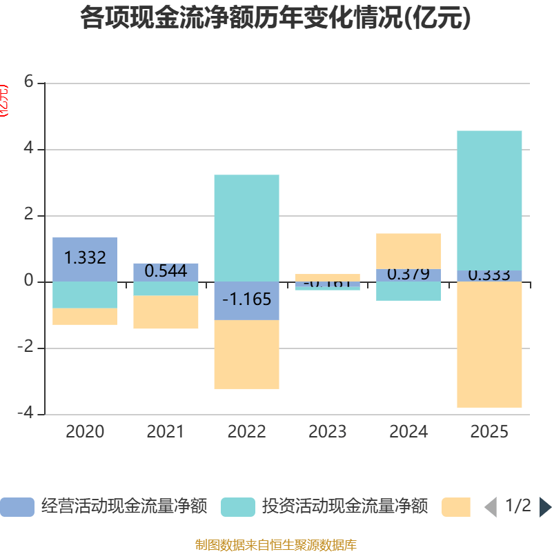 截至2025年,公司经营活动现金流净额为3332.63万元,同比下降12.08%;筹资活动现金流净额-3.81亿元,同比减少4.88亿元;投资活动现金流净额4.22亿元,上年同期为-5801.76万元。