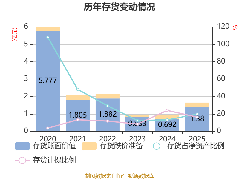 从存货变动来看,截至2025年末,公司存货账面价值为1.38亿元,占净资产的19.75%,较上年末增加6874.8万元。其中,存货跌价准备为2672.51万元,计提比例为16.23%。