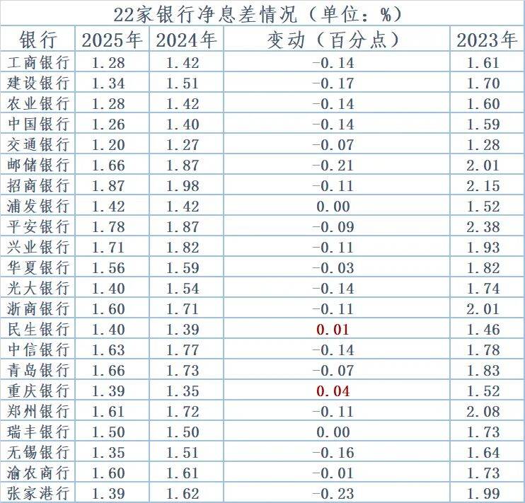 国家金融监督管理总局发布的数据显示,截至2025年四季度末,商业银行净息差行业水平为1.42%,仍处于历史低点。记者注意到,前述22家机构中,高于该平均值的机构仅12家,刚刚过半。