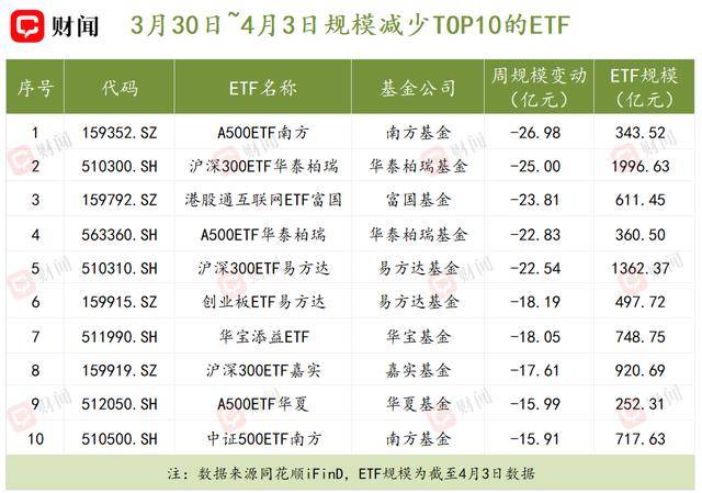 与之形成鲜明对比的是,宽基ETF规模普遍收缩。其中,A500ETF南方规模缩减最为明显,达26.98亿元。此外,沪深300ETF华泰柏瑞、港股通互联网ETF富国、A500ETF华泰柏瑞以及沪深300ETF易方达单周规模缩水均超20亿元。