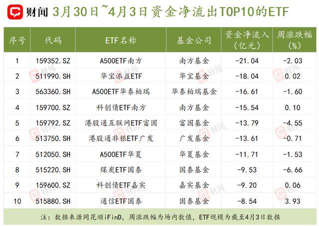 此外,科创债ETF南方、华宝添益ETF、港股通互联网ETF富国、港股通非银ETF广发在上周的资金净流出金额也均超过了10亿元。