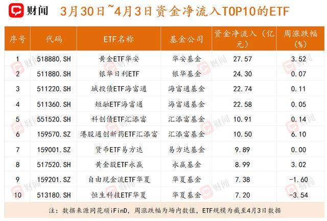 资金流向方面,黄金类ETF成为吸金主力。黄金ETF华安以27.57亿元的净流入额位居榜首,黄金股ETF永赢也吸引了8.99亿元的净流入,位列第八。此外,银华日利ETF、城投债ETF海富通、短融ETF海富通的资金净流入金额均超过20亿元。