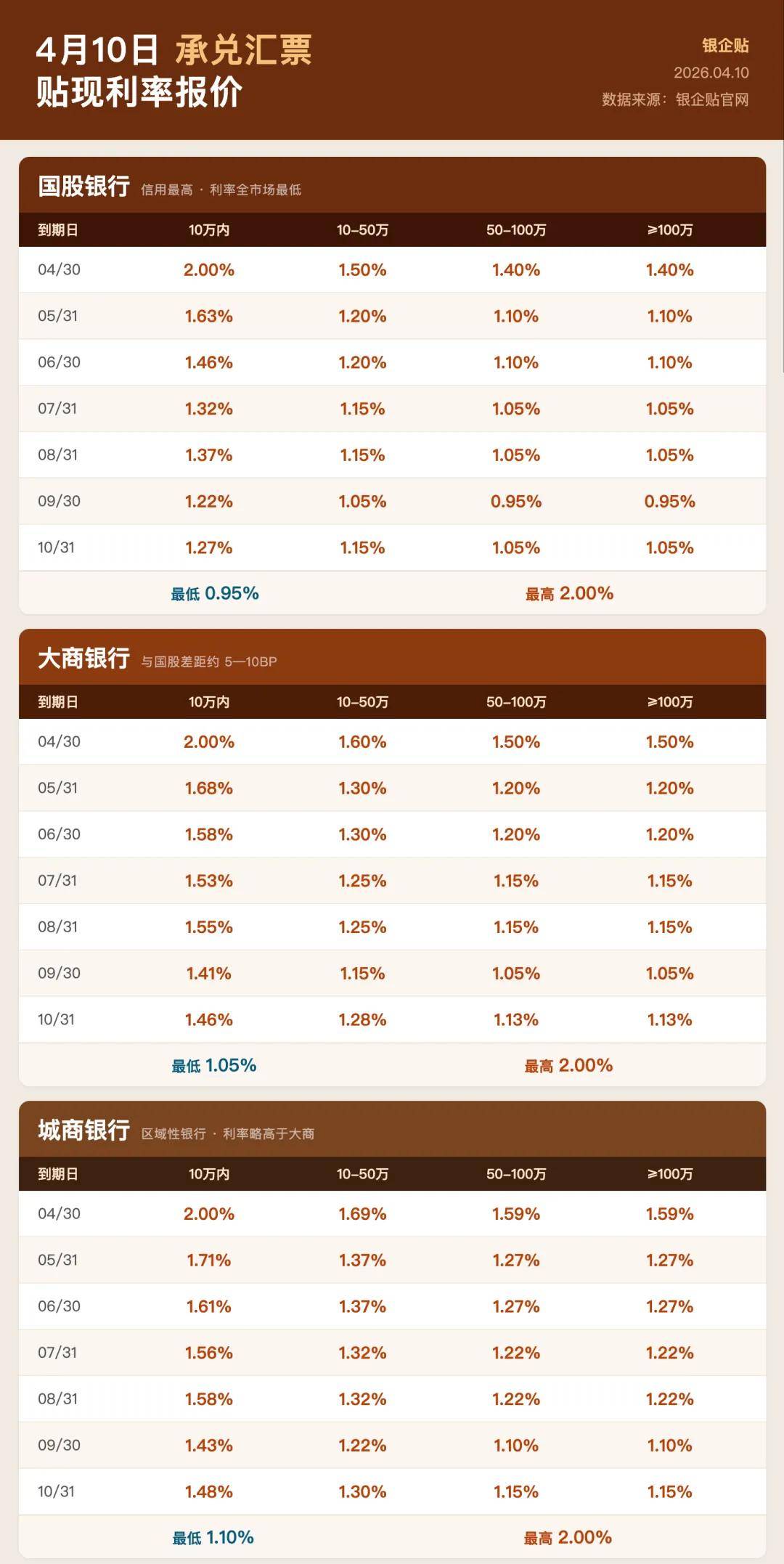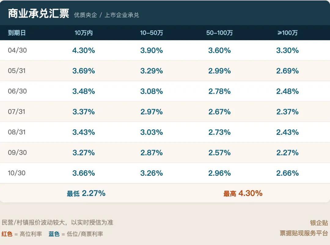 商票由企业自身承兑,利率显著高于银票。优质央企、上市国企开出的商票,贴现利率相对较低;普通民营企业商票则可能难以找到承接机构。今日商票利率较昨日有所上浮,请持票企业注意成本变化。