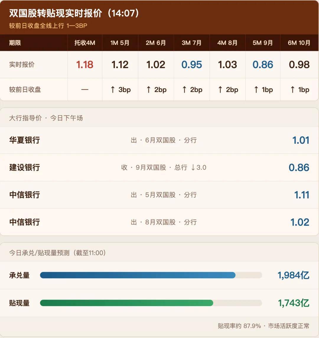 转贴现是银行间票据交易的"批发价",直贴利率以它为定价基础。今日午间双国股转贴现报价较昨日收盘全线上行,1M期限涨幅最大达3BP。