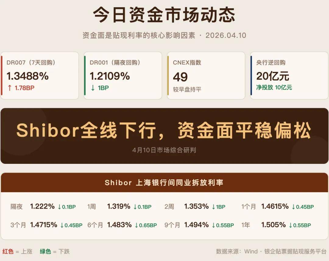 今日午间,票据市场转贴现利率较昨日全线小幅上行1–3BP,资金面整体平稳偏松,Shibor全线下行,但CNEX指数升至49,较早盘有所收紧。央行今日净投放10亿元,流动性保持合理充裕。手里有承兑汇票想贴现的企业,今天仍是成本相对可控的窗口期。