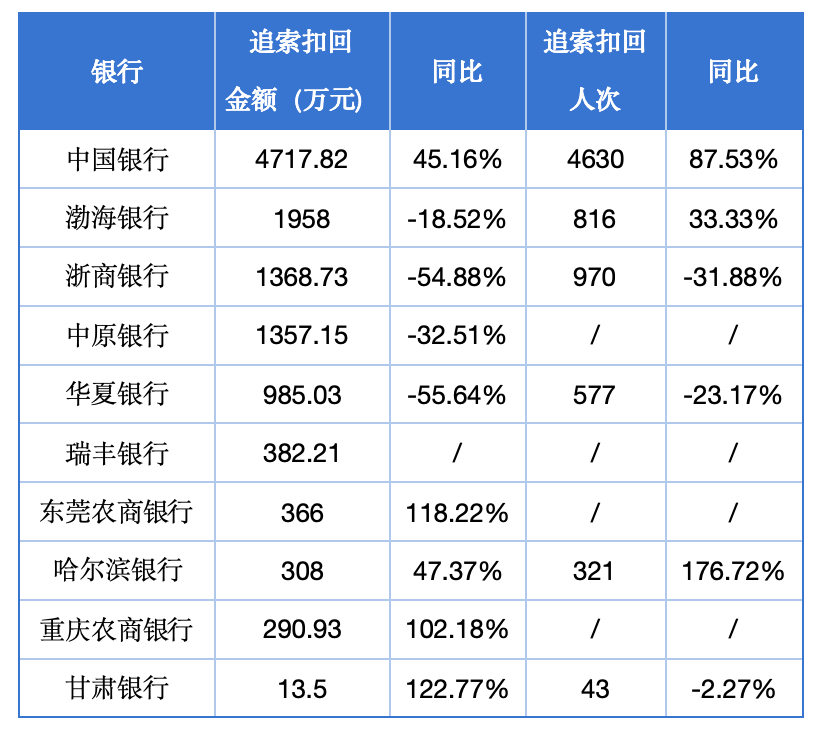 与上年相比,部分银行追索扣回金额和人次出现了大幅增长。如,东莞农商银行、重庆农商银行追索扣回金额均翻倍。