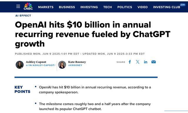 【环球网科技综合报道】6月10日消息,据外媒CNBC报道,OpenAI宣布,其年度经常性收入(ARR)已达到100亿美元,较去年同期的55亿美元实现近翻倍增长。