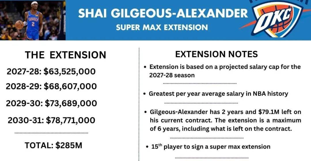 其实按照原本的估算,亚历山大的提前续约合同可以达到4年2.93亿美元,然后最后一年的薪资突破八千万美元,无奈26-27赛季工资帽涨幅不及预期(预期10%,实际7%),从而导致前者最终只能签下4年2.85亿美元。