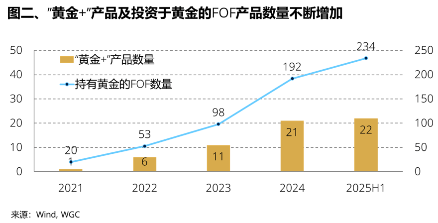 而广义的“黄金+”则指的是一种配置理念,它将黄金嵌入到多资产组合中的配置之中,作为风险对冲与收益平滑的重要因子。除“黄金+”产品持续扩容外,专业机构对黄金的直接投资也显著增长。过去几年,配置黄金ETF的FOF产品数量几乎每年翻倍。