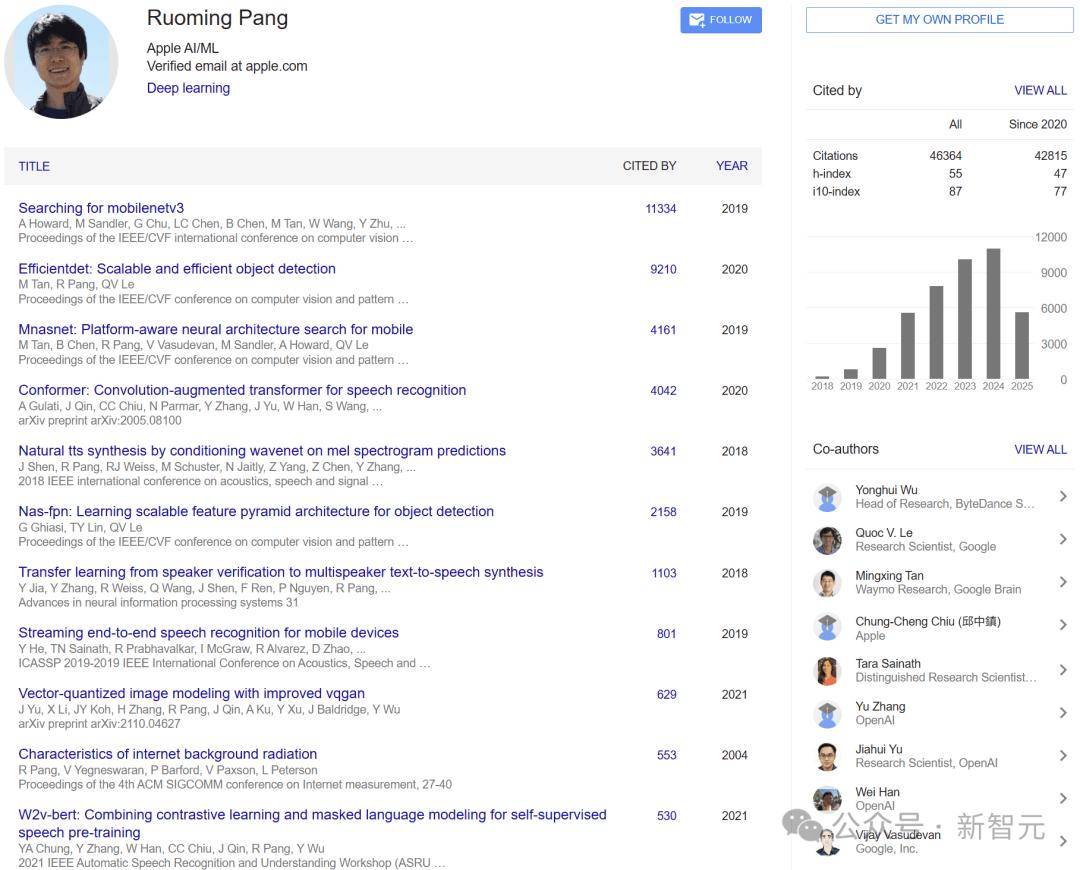 庞若鸣的个人Google Scholar中,发表了多达100多篇有影响力的研究,个人被引数超46000。