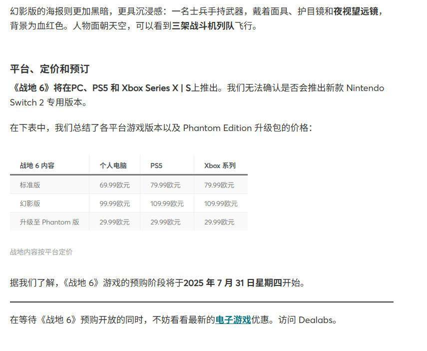 坤哥爆料,《战地6》标准版、幻影版在PC,PS5和Xbox Series上的售价如下: