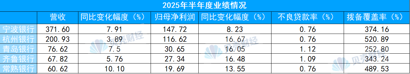 目前,A股上市银行中,杭州银行、常熟银行、宁波银行、齐鲁银行、青岛银行已发布2025年半年度业绩快报,5家银行均实现了营收、归母净利润双增长。其中,杭州银行、齐鲁银行、青岛银行归母净利润同比增幅超16%。