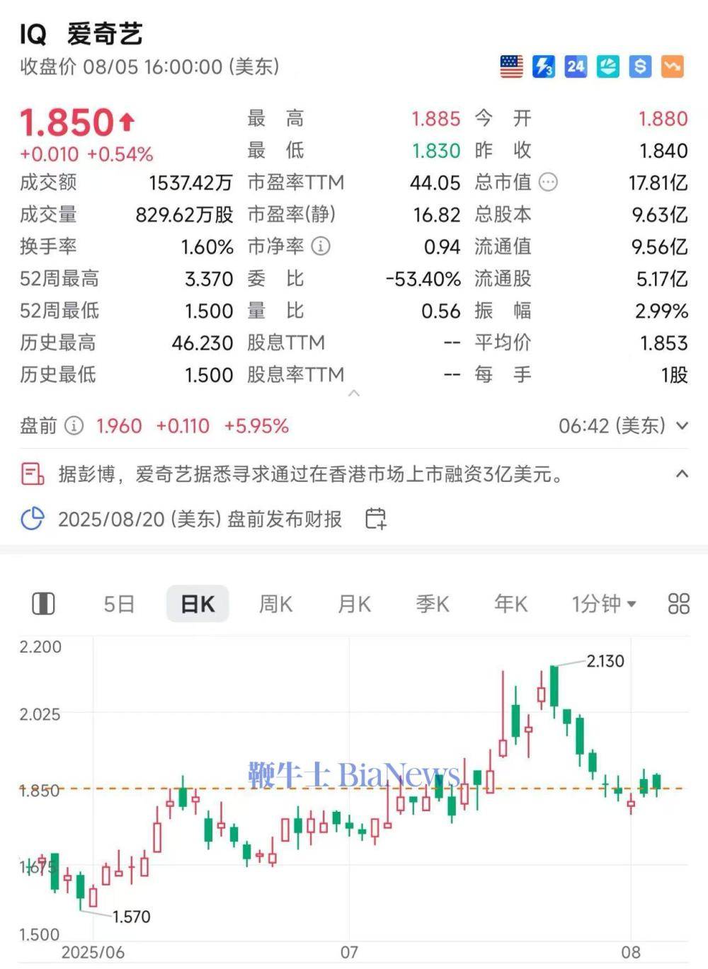 8月6日,据彭博社报道,爱奇艺寻求通过在香港市场上市融资3亿美元。