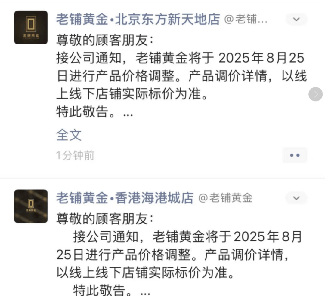 另外,多个老铺黄金的店铺账号及相关店员、销售均在社交媒体发布调价消息。