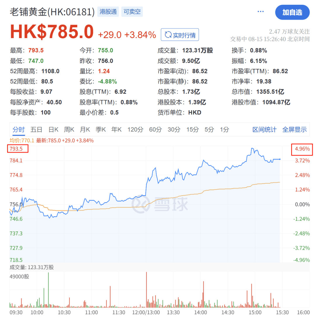 日午后,港股老铺黄金股价抬升,盘中涨幅一度接近