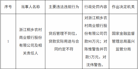 【大河财立方消息】8月18日,国家金融监督管理总局嘉兴监管分局披露的行政处罚信息显示,因贷后管理不到位,贷款实际用途与合同约定不符,浙江桐乡农村商业银行被罚款90万元;陈惟被警告并罚款5万元,沈伟被警告。