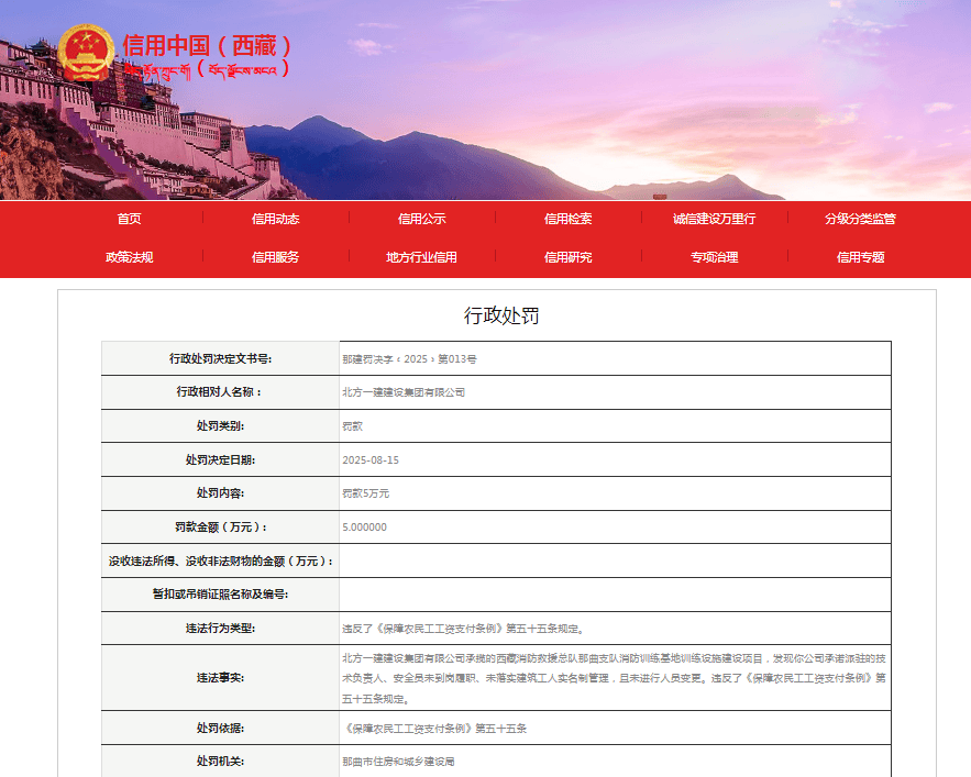 齐鲁晚报·齐鲁壹点记者于信用中国(西藏)行政处罚栏获悉,8月15日,北方一建建设集团有限公司(下称“北方一建建设集团”)收行政处罚决定书,违法行为类型为:违反了《保障农民工工资支付条例》第五十五条规定。