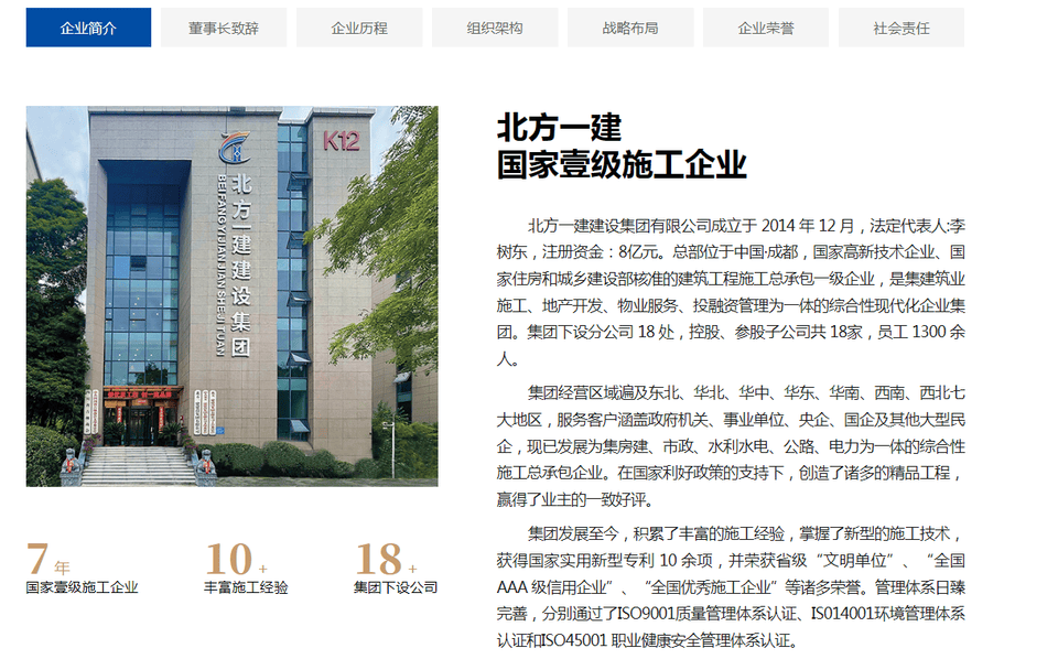 据北方一建建设集团介绍,公司是集建筑业施工、地产开发、物业服务、投融资管理为一体的综合性现代化企业集团。集团下设分公司 18 处,控股、参股子公司共 18家,员工 1300 余人。集团经营区域遍及东北、华北、华中、华东、华南、西南、西北七大地区,服务客户涵盖政府机关、事业单位、央企、国企及其他大型民企。